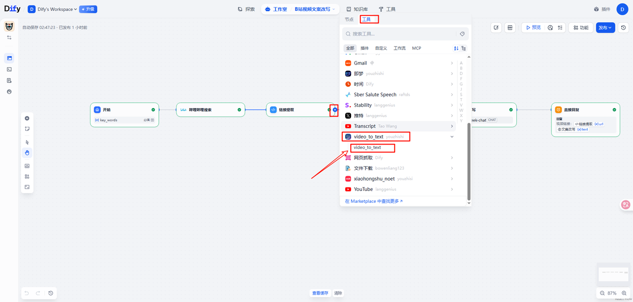 点击添加节点,选择工具,找到Video_to_text添加工具Video_to_text,可修改名称为“视频文案提取”