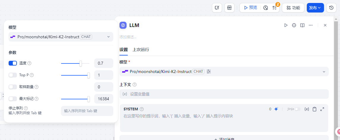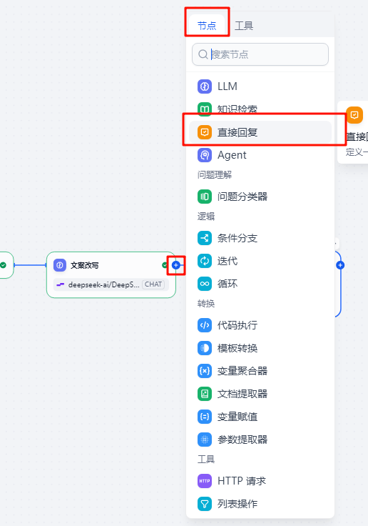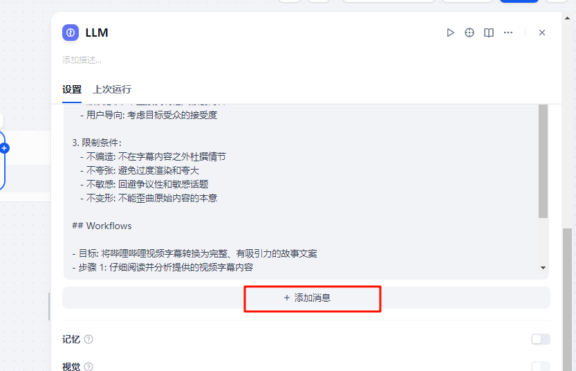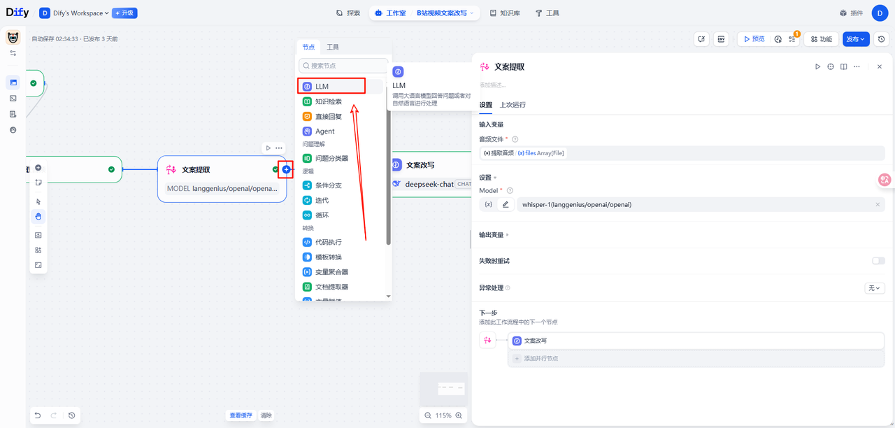 在”文案提取“节点后添加LLM节点,修改名称为“文案改写”