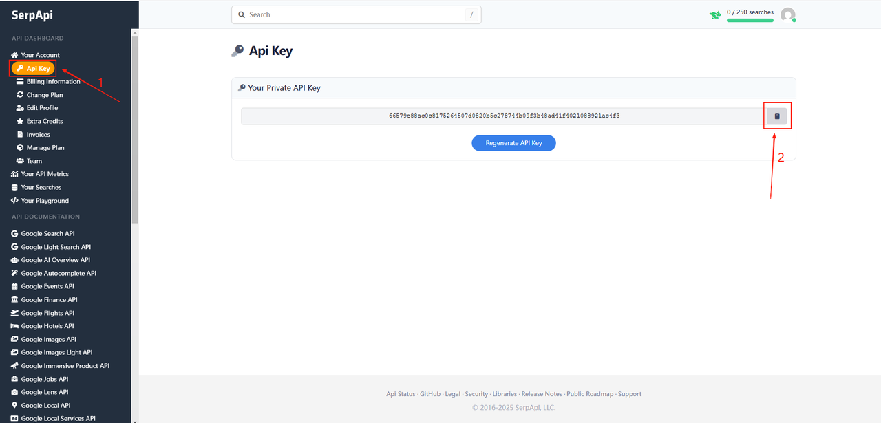 SerpAPI提供每月 250 次搜索的免费调用次数,这足够我们完成本次实验了如果你需要更多的额度,可以增加余额,或者使用其他的开源方案。