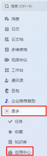 找到飞书左侧菜单栏的“更多”-“应用中心”