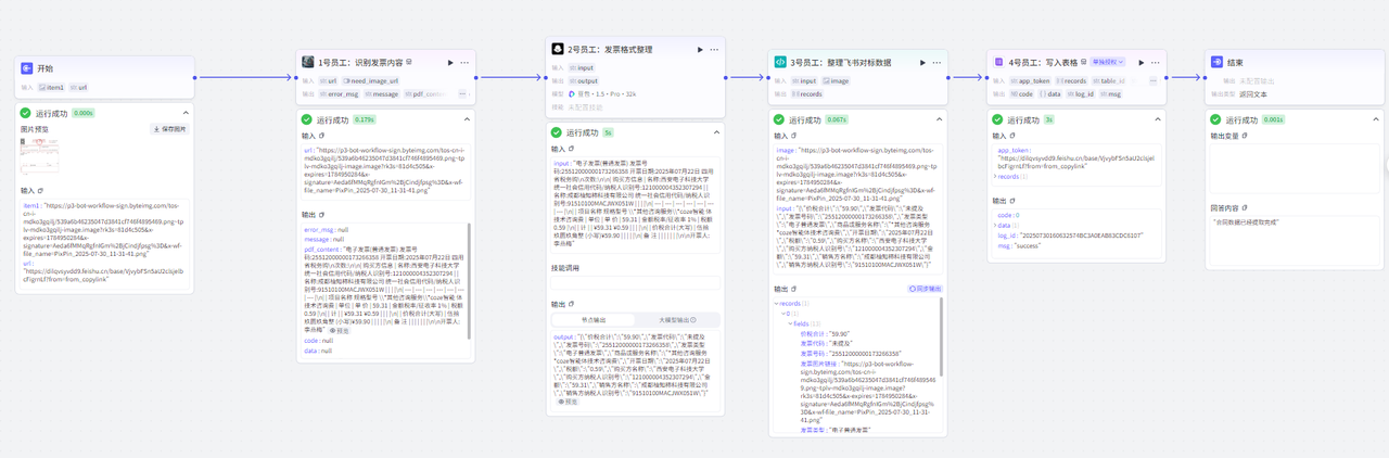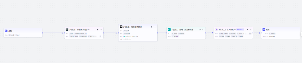 我们预设的工作流程是这样:对发票图片里的信息提取——整理提取的信息(确保准确,是写入飞书表格的格式)——将整理后的数据写入飞书表格——接下来需要通过添加扣子空间的应用扩展,并为扣子空间配置多维表格,通过扣子空间完成数据分析