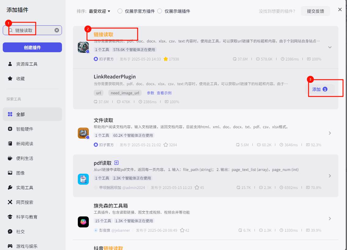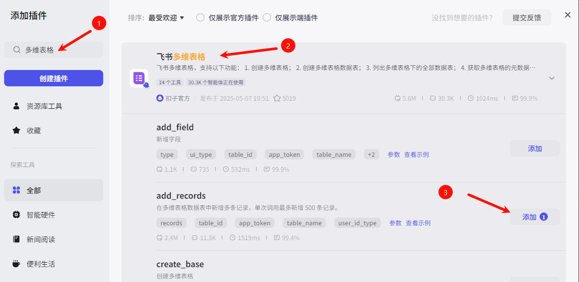 插件里面找到“扣子官方”的插件