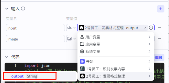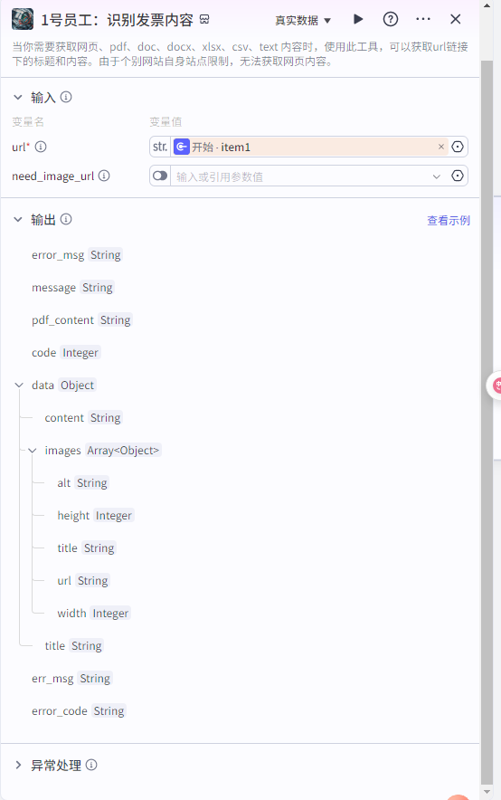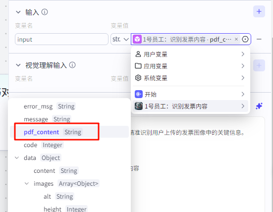 ![]() 输入:发票识别内容的“pdf_content”