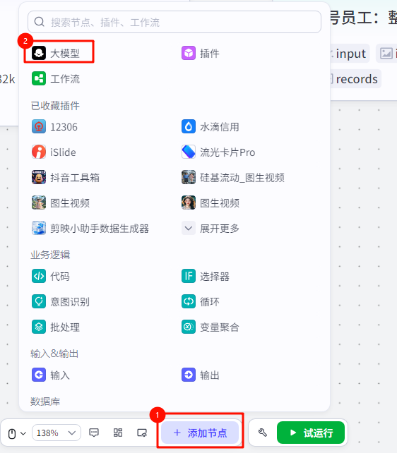 添加大模型节点,对上一个节点提取的信息进行提取整理