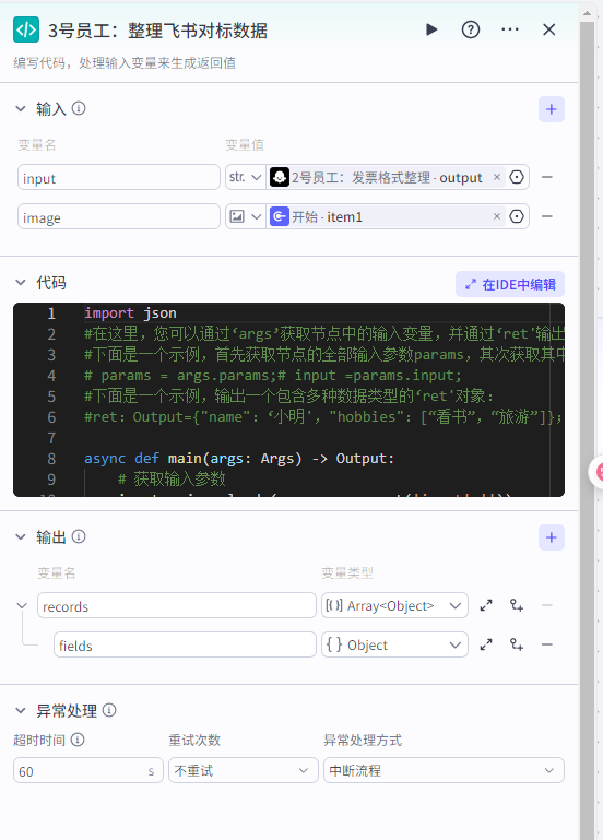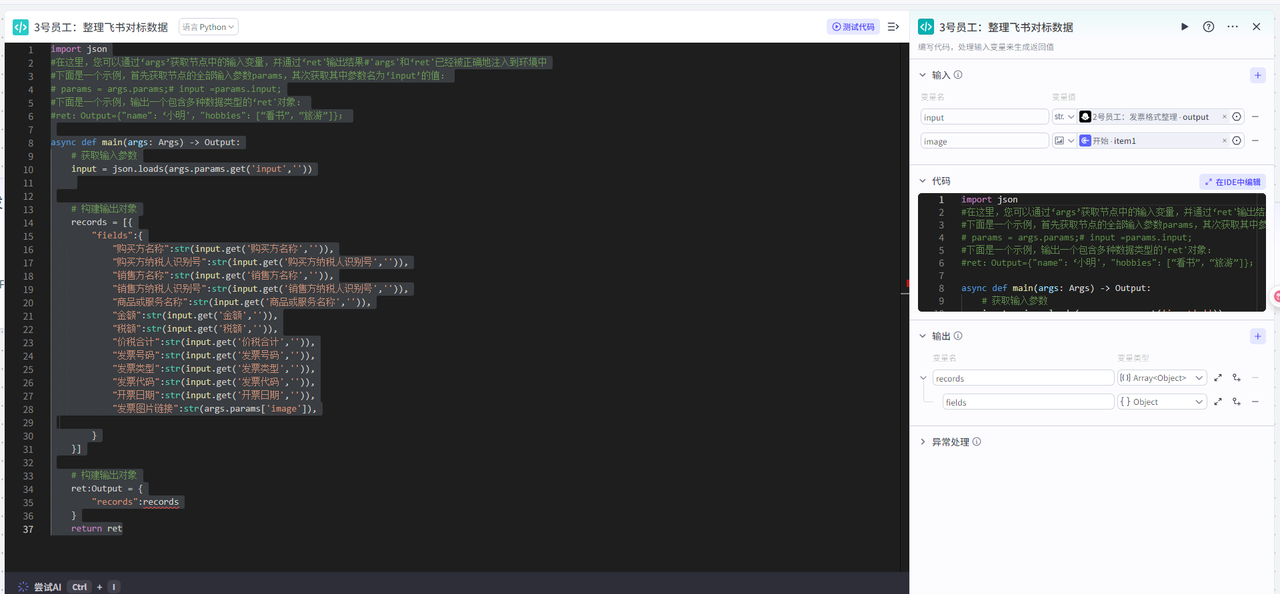 这块代码节点的主要目的是将插件输出的变量转化为多维表格可以识别并且能与我们创建的表格各表头一一对应的格式 多维表格可以识别的数据格式为: