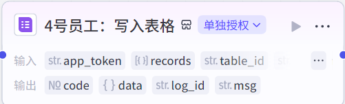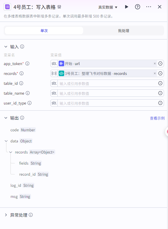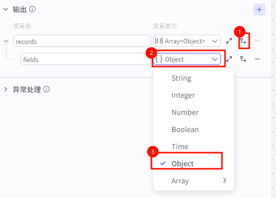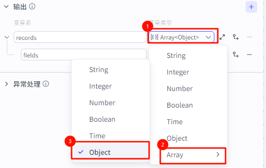 ![]() ![]() 输出要选择变量类型为“Array<Object>”,因为导入多维表格的数据只接受这个类型的变量