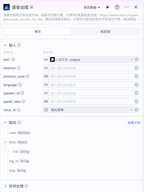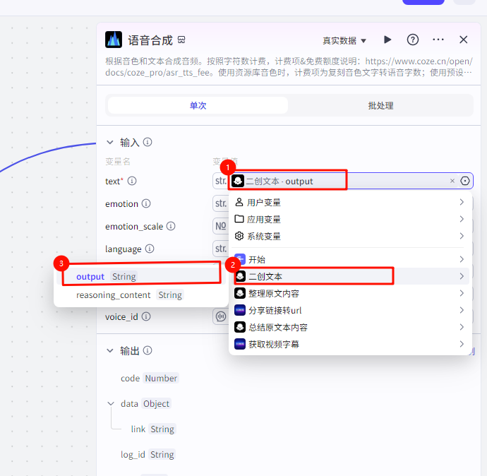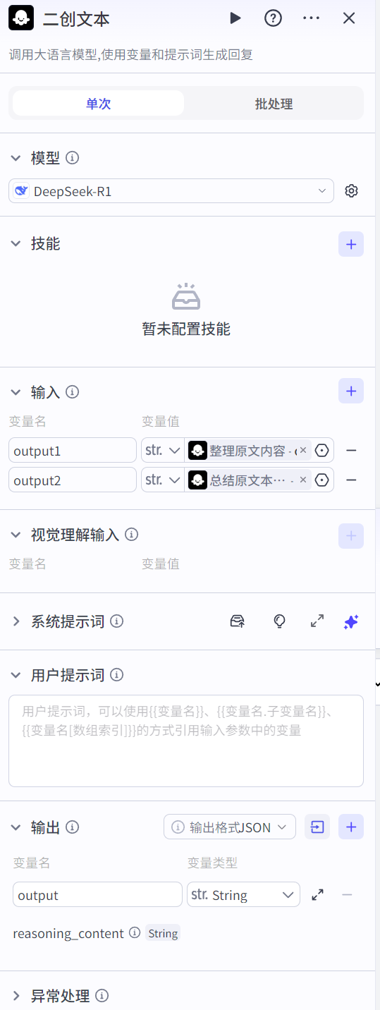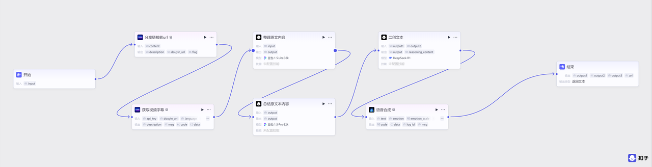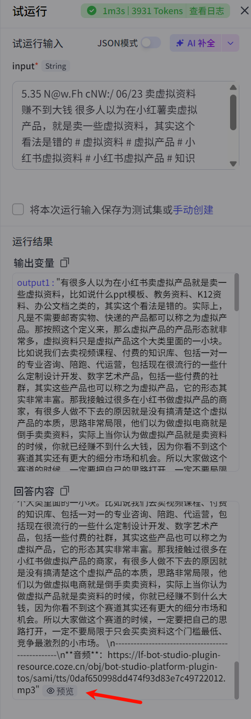 ![]() 输入四个变量,原文内容,原文的分析总结,二创文本及音频链接