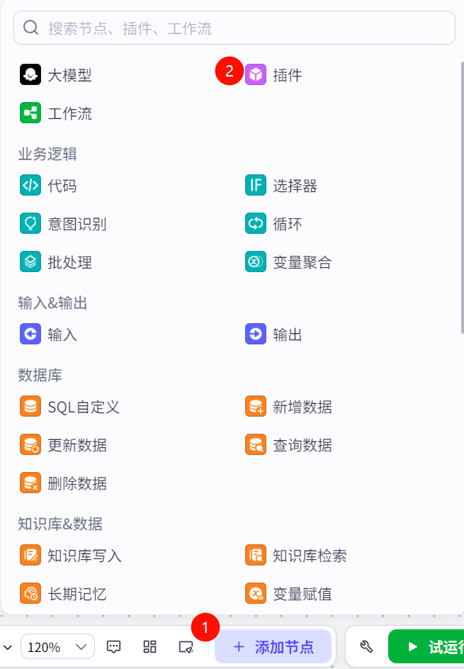 里面用到的插件我们都在“添加节点-插件”中添加,然后在插件库中左上角搜索相应插件