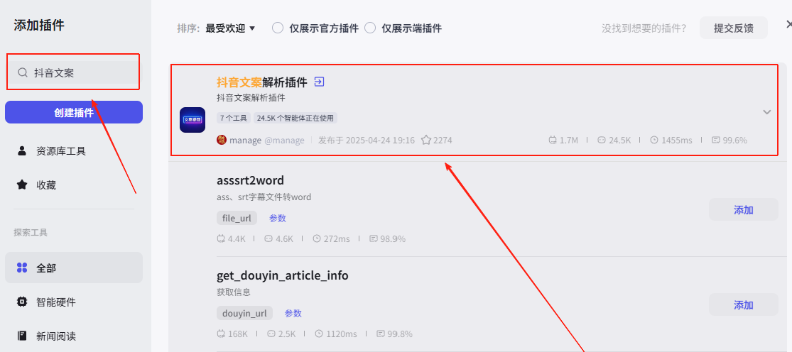 ![]() 插件库中搜“抖音文案”选择如图插件并添加