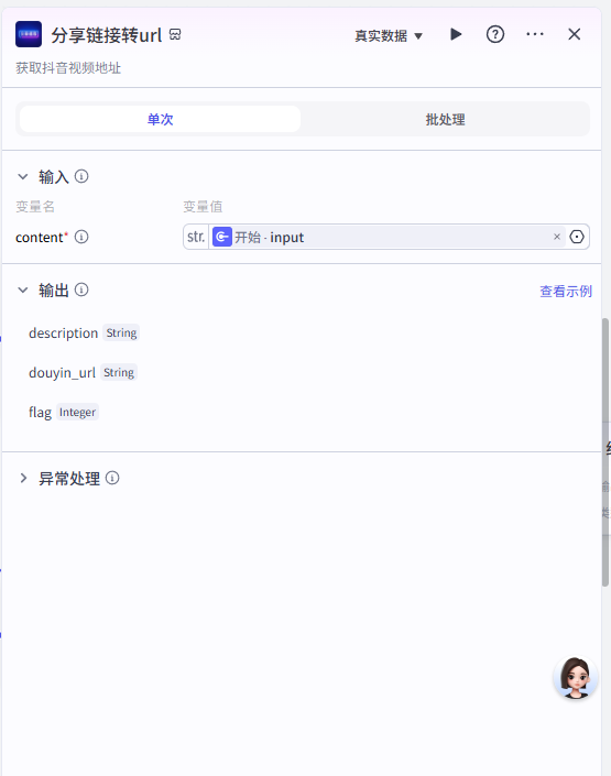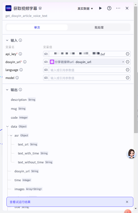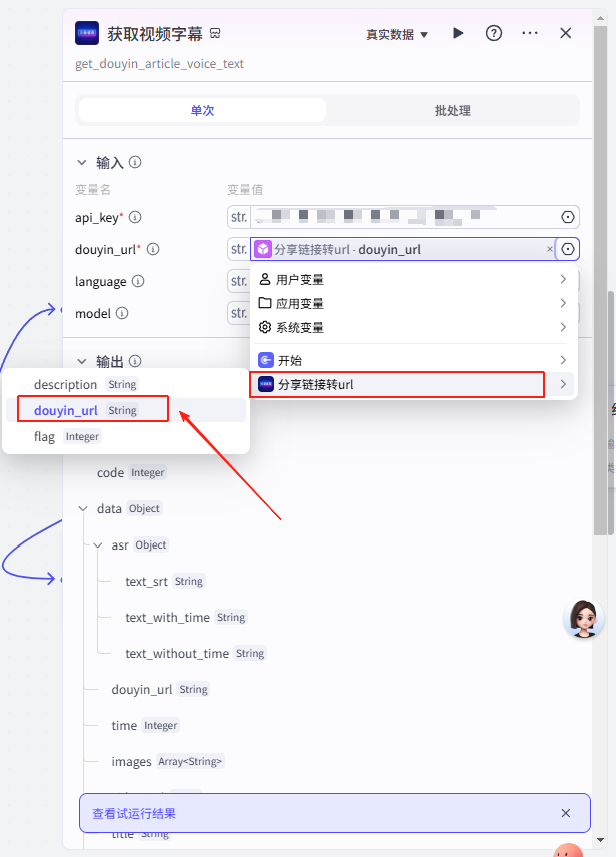 ![]() ![]() 然后是输入部分,需要输入APIkey和上一个节点提取到的抖音url