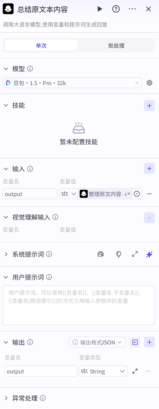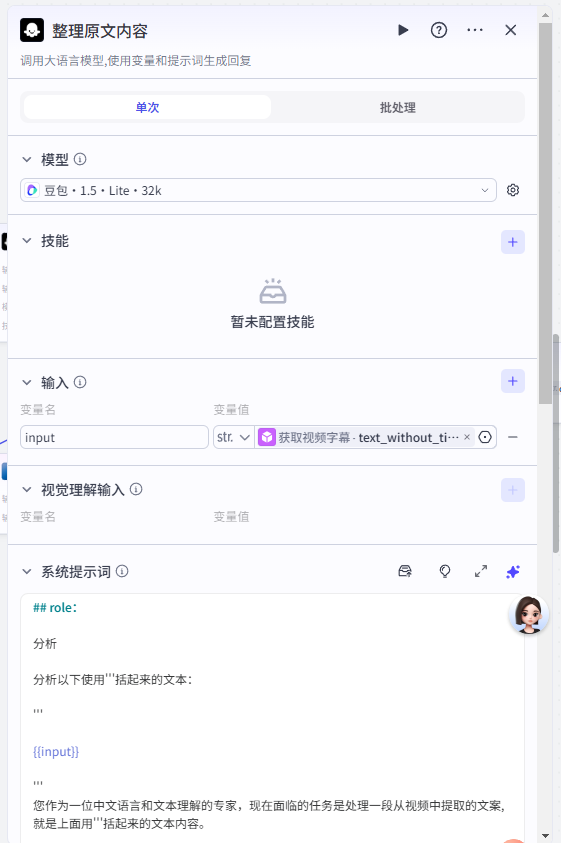 ![]() 这一步对大模型能力要求不高,主要是整理视频转文案,选择豆包lite提高工作速率即可