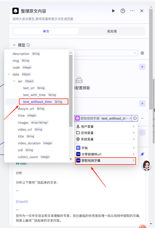 ![]() 这个大模型输入选择上一个插件节点的“text_without_time”,即视频文本内容