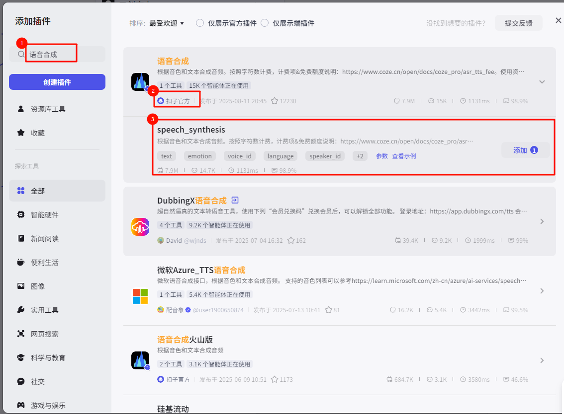 ![]() 选择喜欢的声音添加到工作流中,支持资源库音色和预设的音色