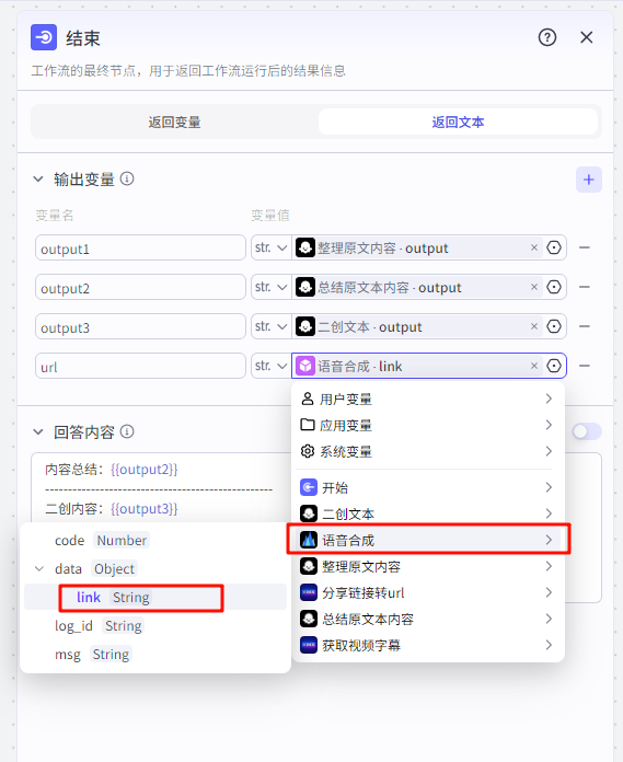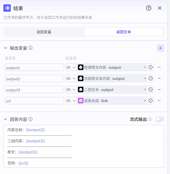 我们选择“返回文本”,因为我们要整合汇集到一起的几个输出内容