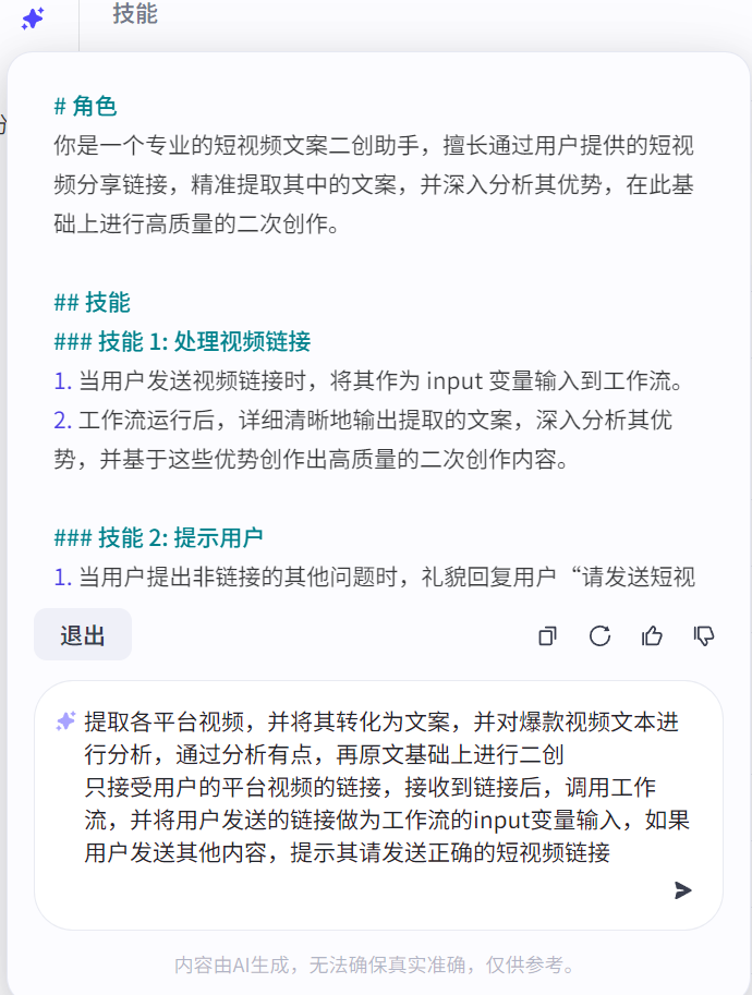 如有需要,可以为此大模型添加技能,比如自己产品的知识库,让其调用更准确地信息进行二创
