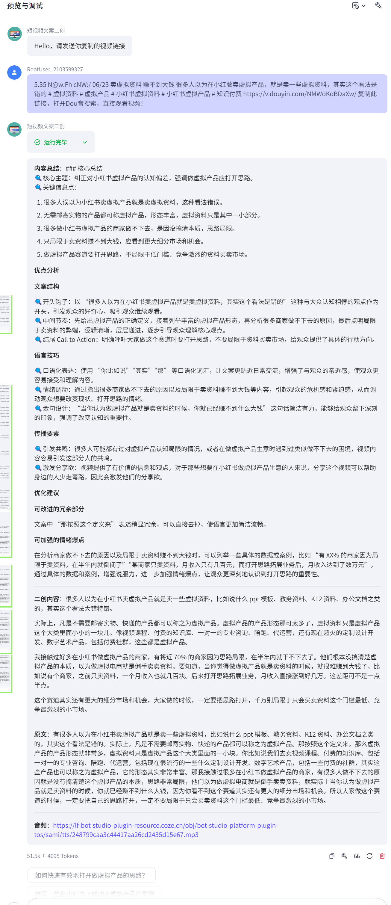 只需要视频的分享链接,就能通过coze实现以上功能,今天带大家做的一个coze应用实例就是一键提取抖音及各平台视频文案,并且对文案进行分析再加工,这样一个非常实用的智能体。