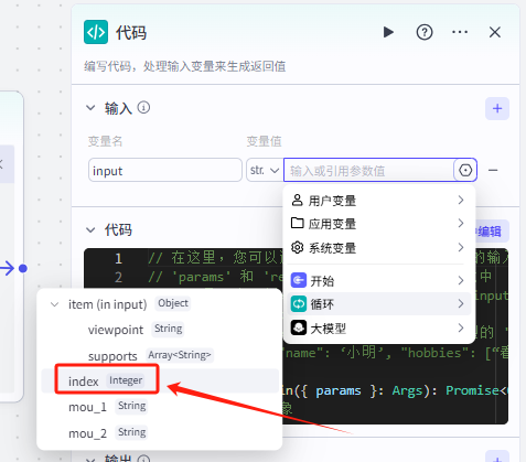 然后点击代码节点进行变量的配置,将输入选为循环节点的index,代码部分实现index每次循环都会+1