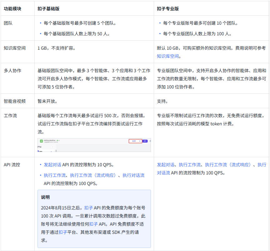 但Coze还有基础版和专业版之分,不过基础版是免费的,对于个人开发者而言,基础版是完全够用的