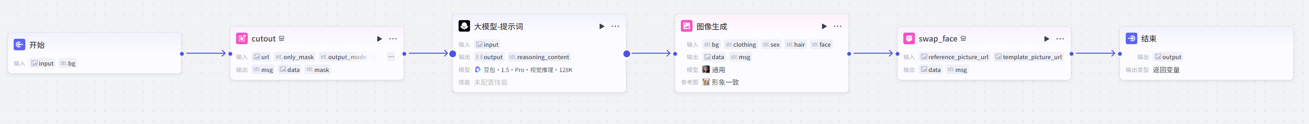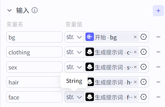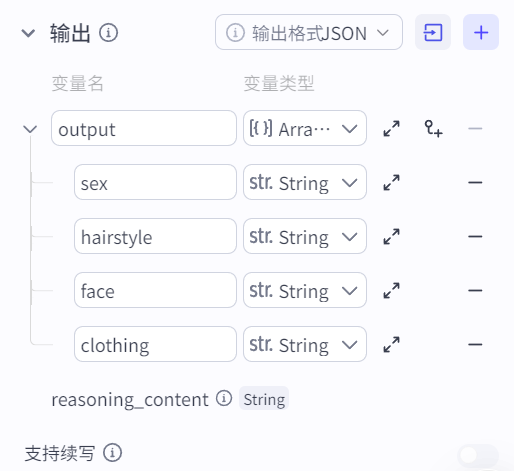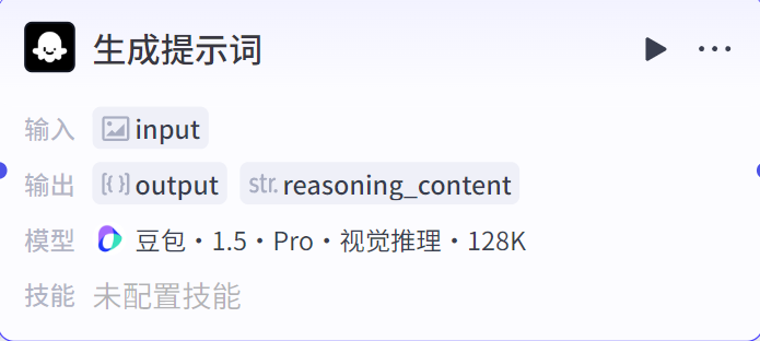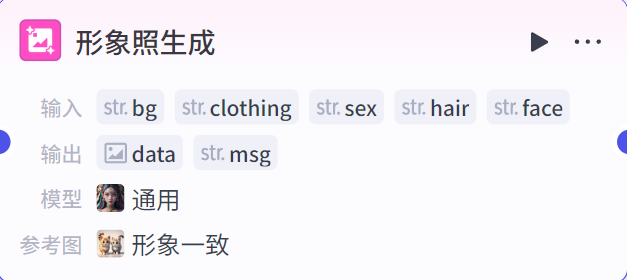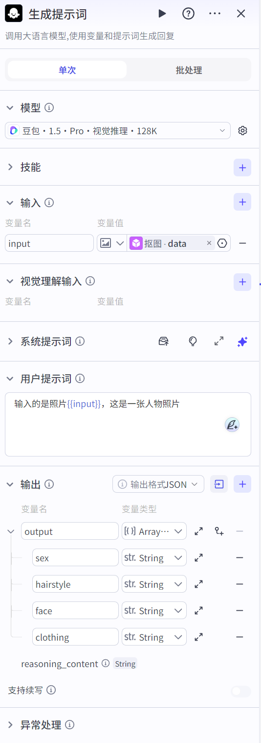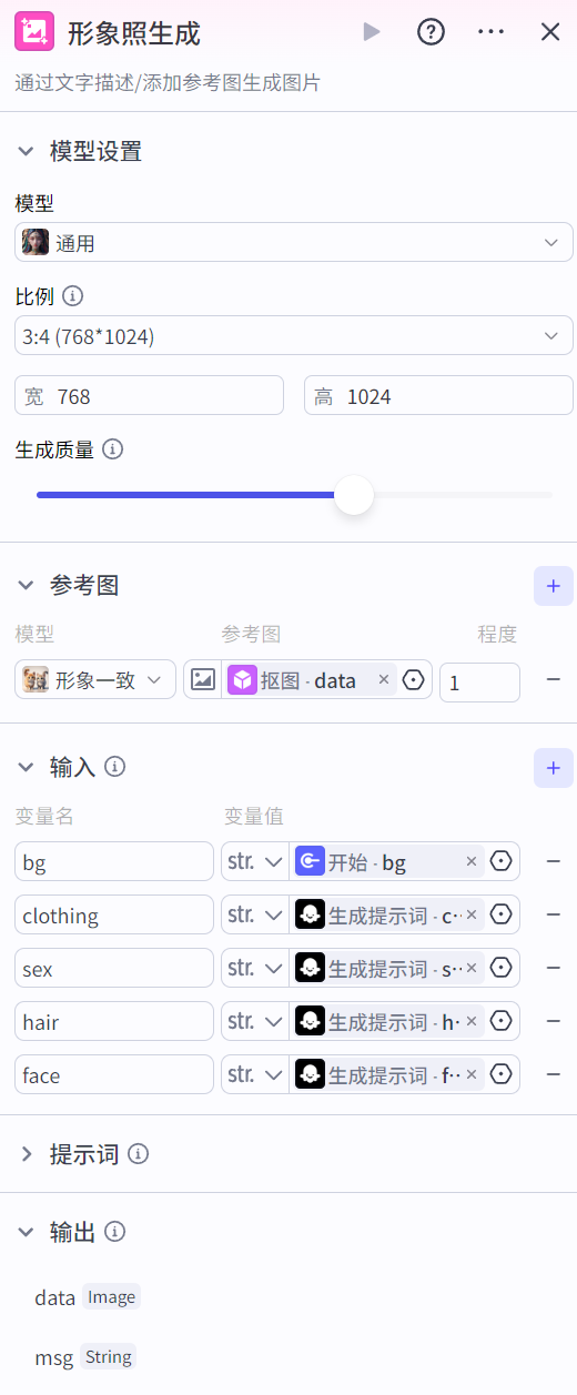![]() 输入有两部分,一个是开始节点输入的背景要求,另一部分的几个变量是上一个大模型节点生成的关于形象描述的提示词