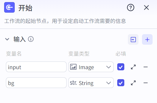开始节点需要添加到两个变量 一个变量是我们上传自己的照片,即是图像格式的文件,所以变量类型选择“File”下的“Image”
