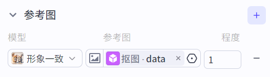 参考图这里选择参考抠出来的人物形象图,模型选择形象一直,“程度”1就是最大程度还原,越低参照参考图的程度就越低