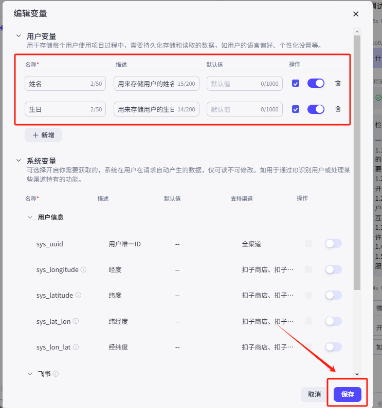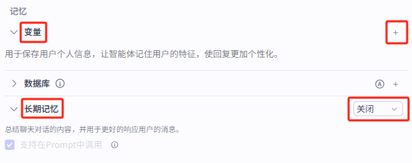 但是这里的处理逻辑是,必须要在智能体的技能配置板块添加变量,以及开启长期记忆的功能