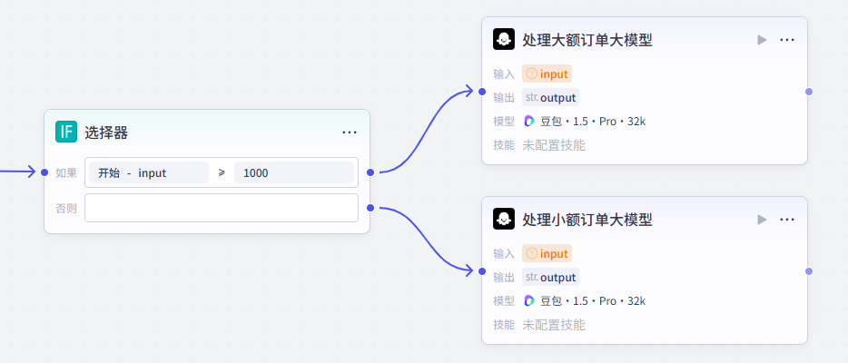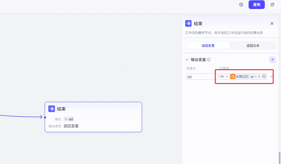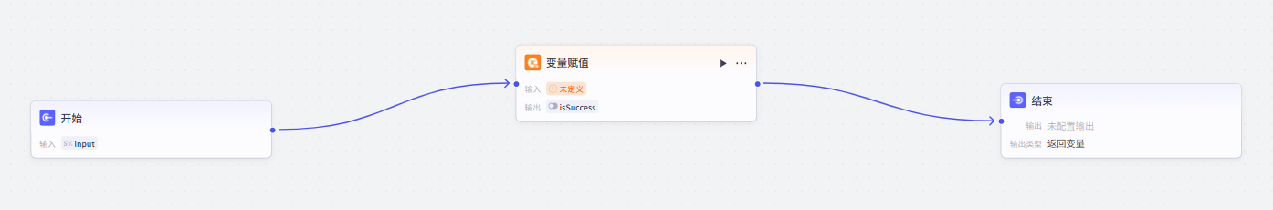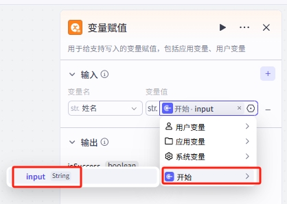这样就可以实现变量的赋值了,甚至还可以在这个节点中添加一个输入节点,将用户的输入作为变量的赋值,或者添加一个大模型去处理用户的输入,从中分析出哪个文字能够作为我们的变量值