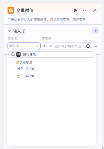 可以看到这个节点的配置就是一个简单的变量写入,通过用户的输入完成给变量赋值
