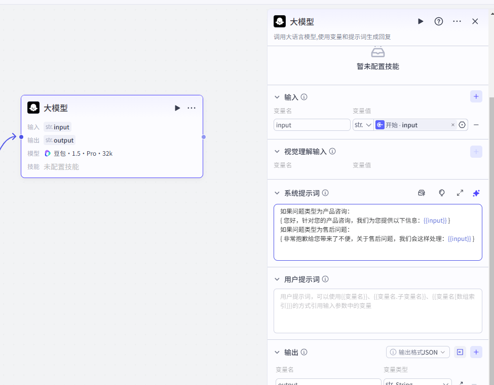 而且,我们还可以在工作流中添加一个大模型节点,专门用于根据变量的值来生成不同的提示词,然后再将这个提示词传递给另一个大模型节点进行回复生成