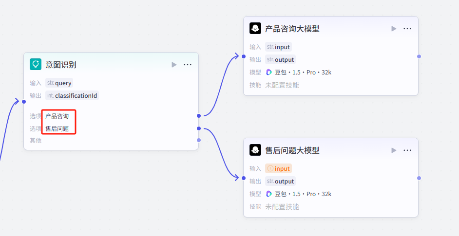 假设我们有一个智能客服的工作流,其中有一个变量“问题类型”,它可以取值为“产品咨询”、“售后问题”等
