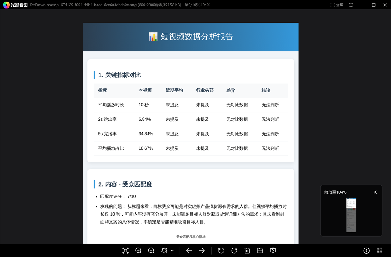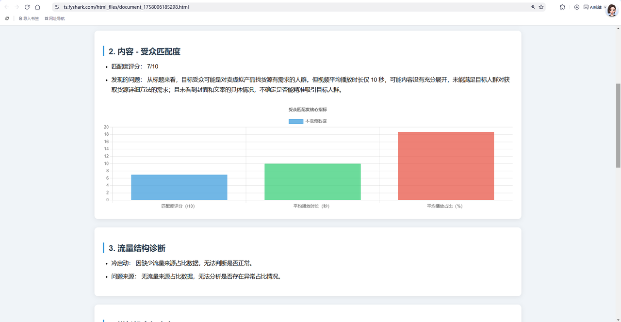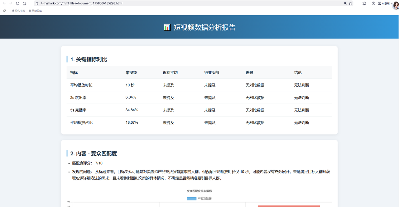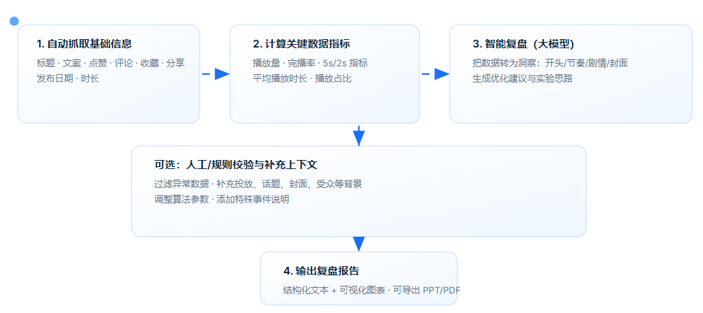 调用大模型复盘分析:将冷冰冰的数字转化为有逻辑的洞察,例如“开头吸引力不足导致 2s 跳出率偏高”、“中段剧情反转有效提升了平均播放时长”