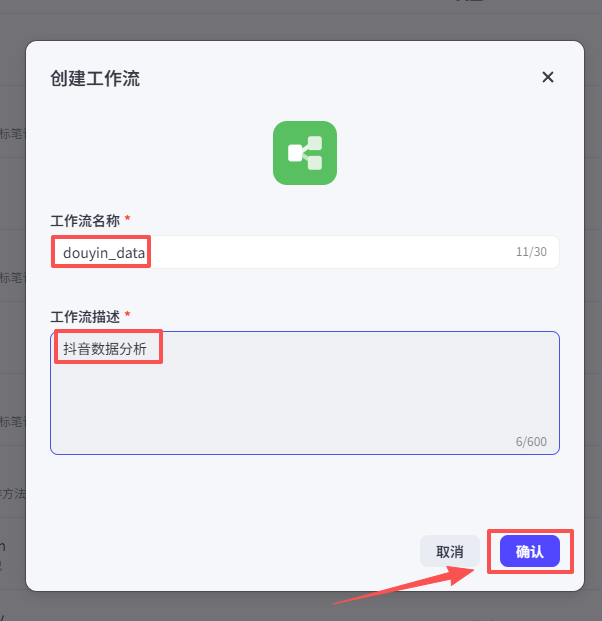 输入工作流名称和简单的工作流描述,点击确认