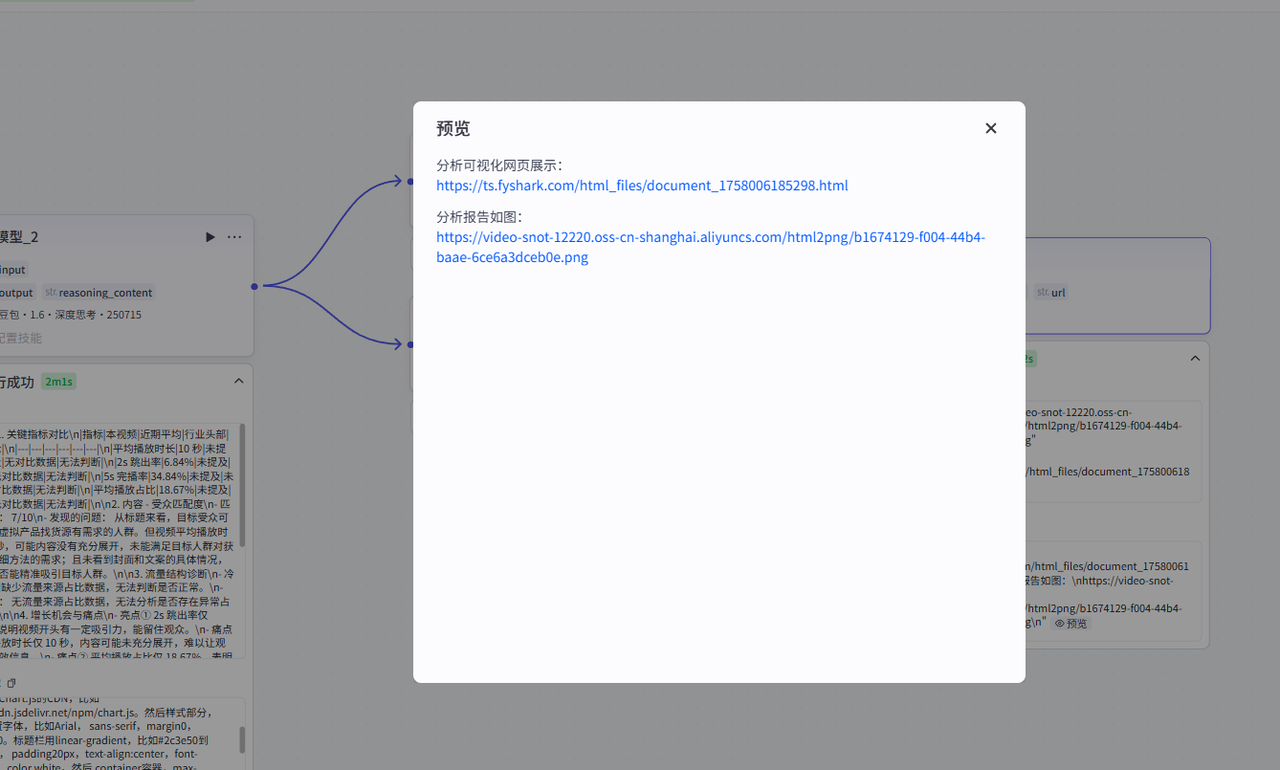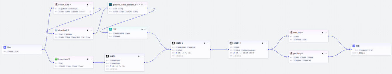 这个完整的工作流是这样的:开始节点之后,两条线并行,分别处理用户上传的抖音链接和数据截图,然后大模型再处理生成可视化报告,再通过插件处理为html和图片转出