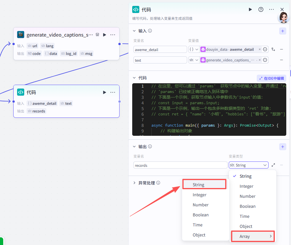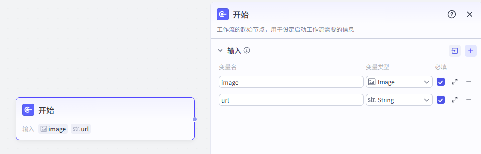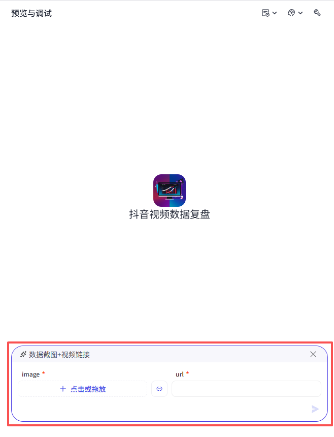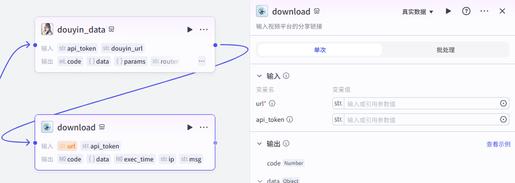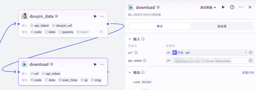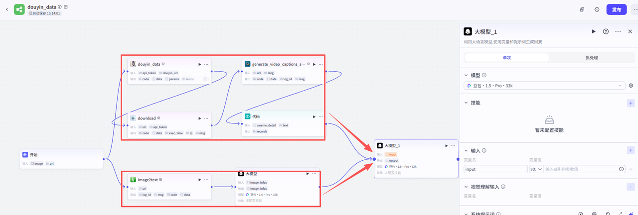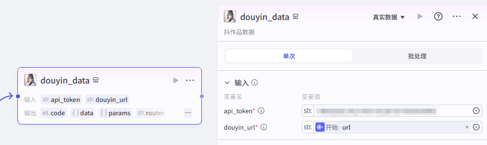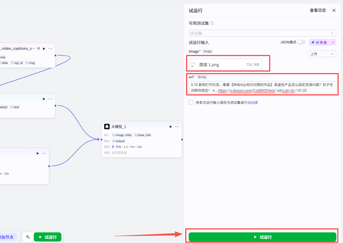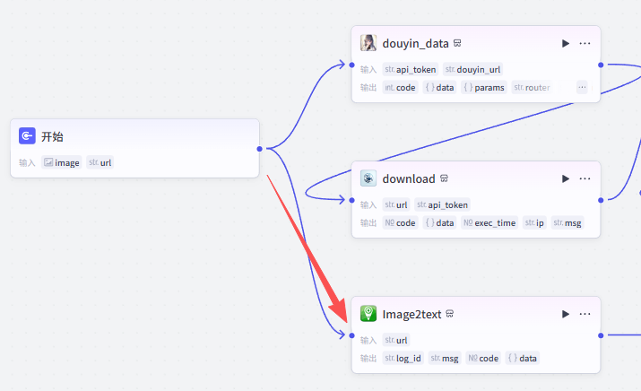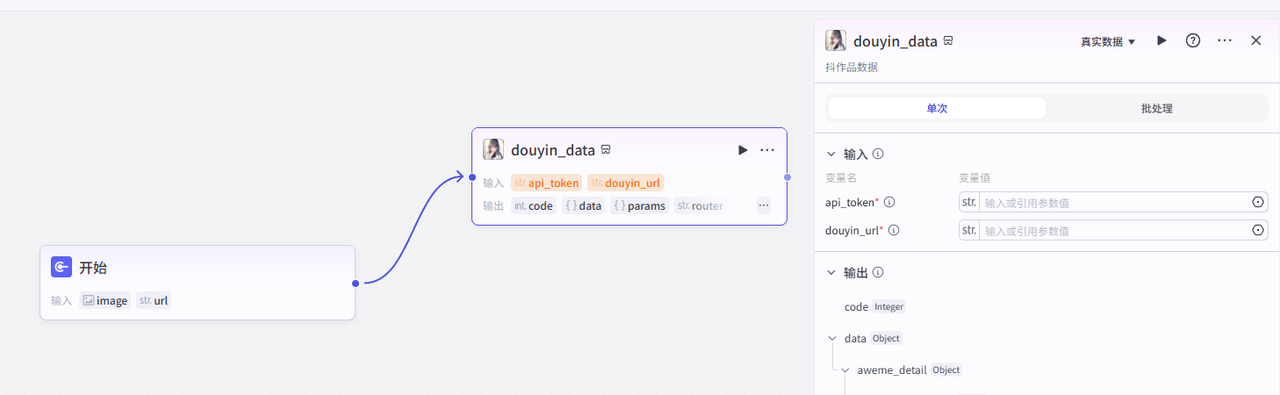 开始节点需要接收两个输入,一个是视频数据的截图,一个是抖音视频分享链接