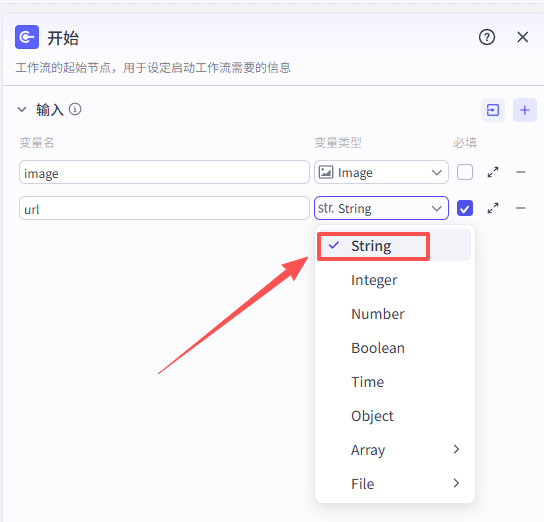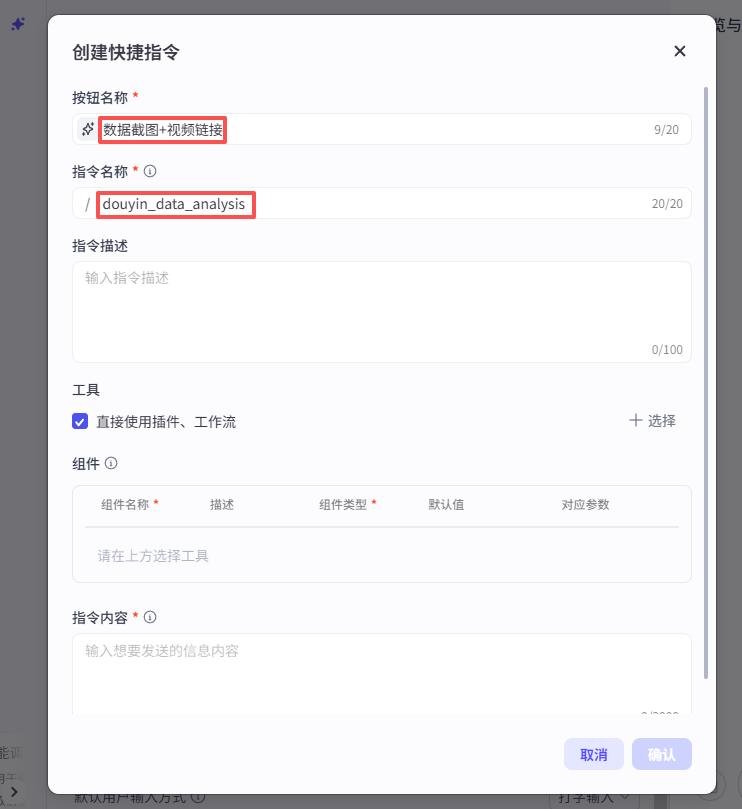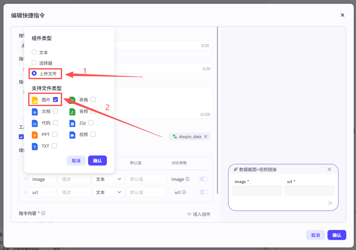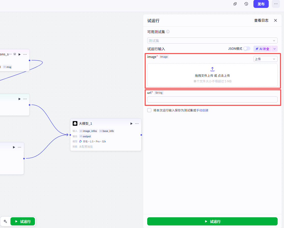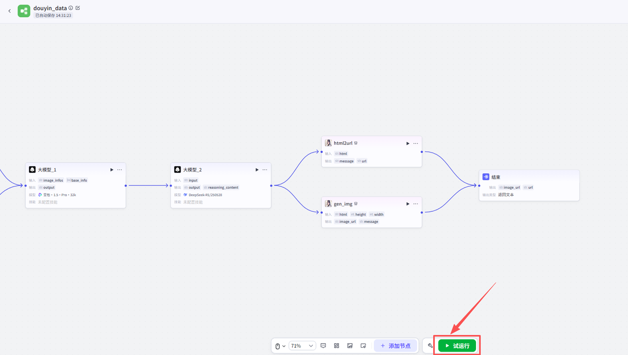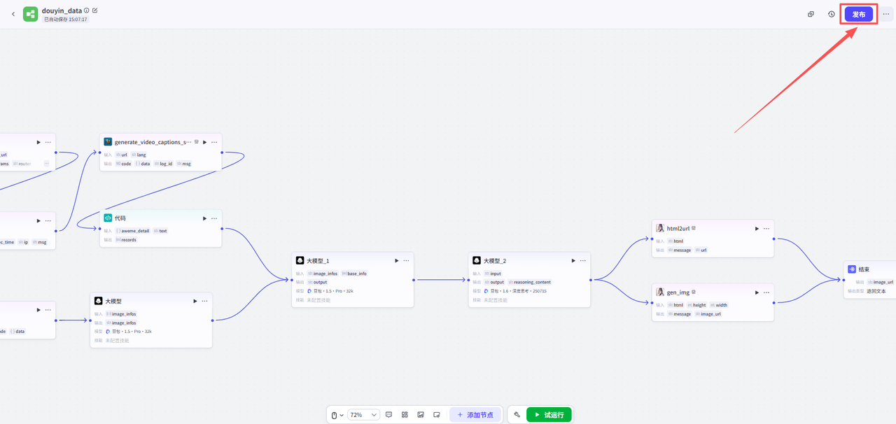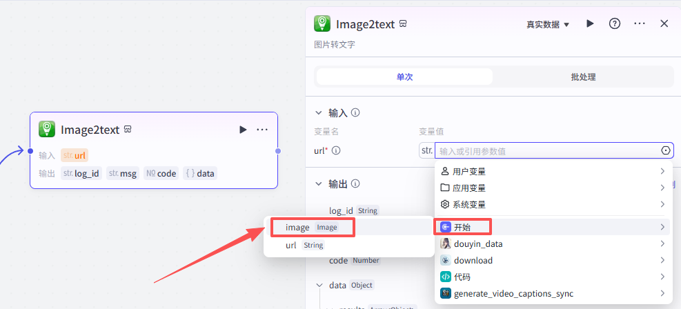 开始节点需要接收两个输入,一个是视频数据的截图,一个是抖音视频分享链接
