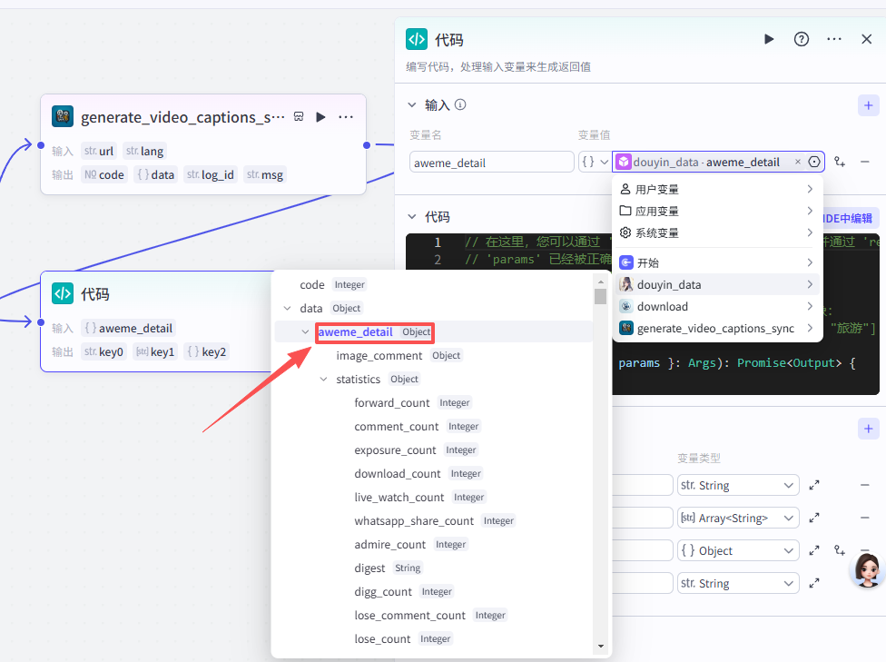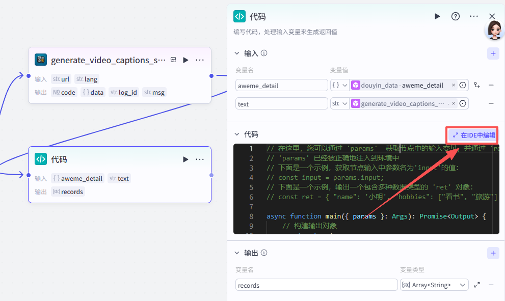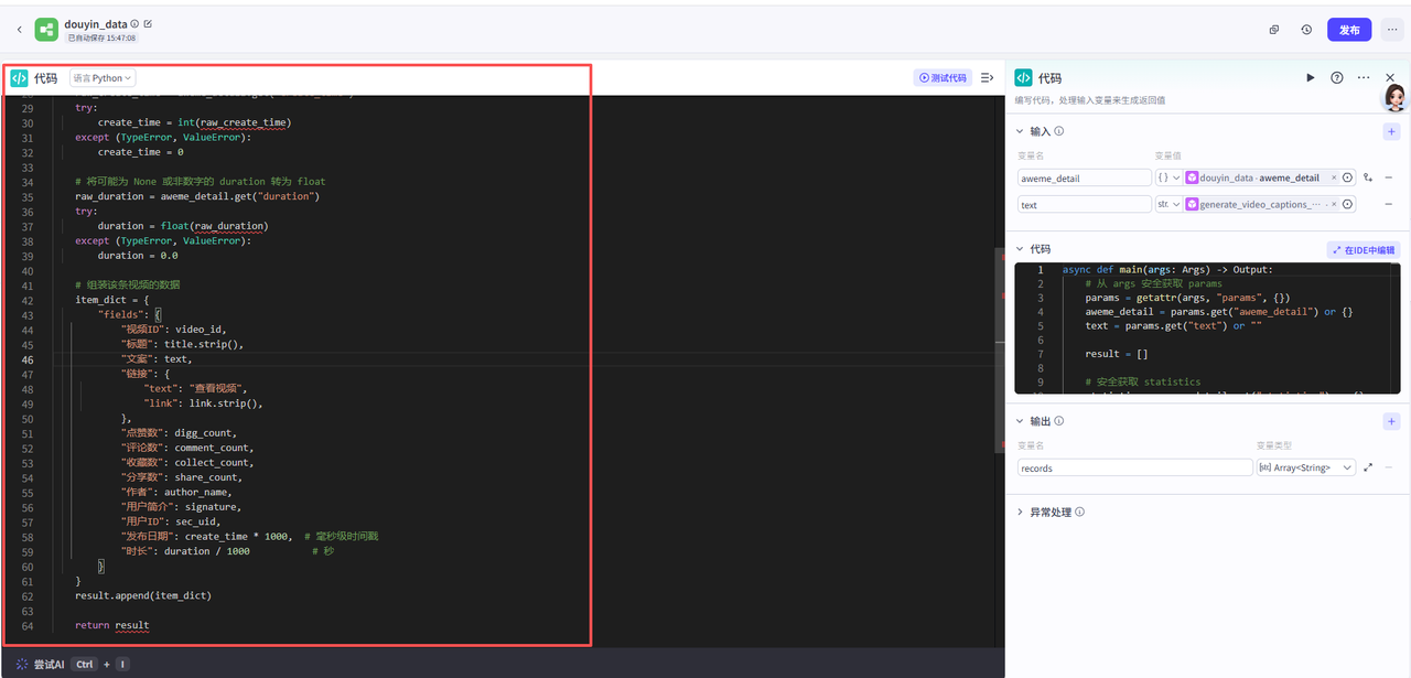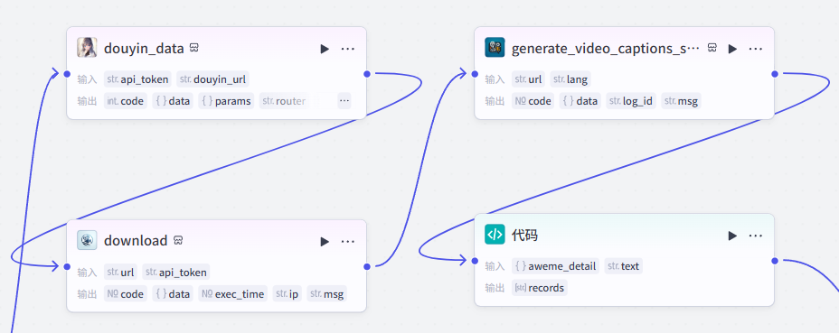 该部分共有四个节点,用于处理开始节点上传的抖音链接,提取主要文案并处理视频数据