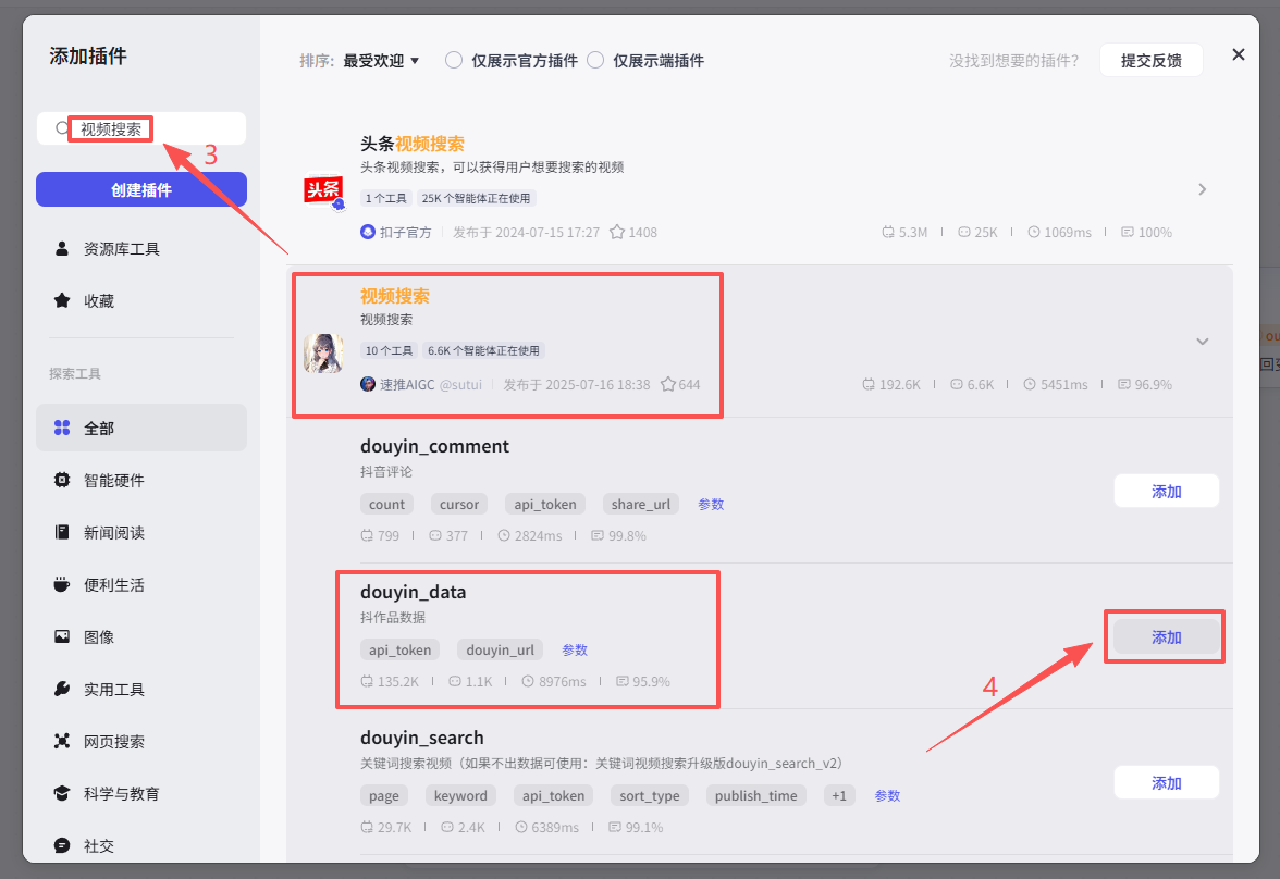 在输入框中输入视频搜索,看到我们框选出来的这个插件,选择添加他的douyin_data接口