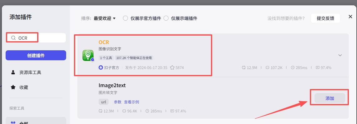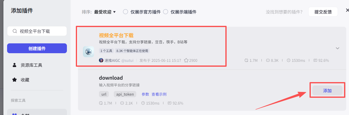 在输入框中输入视频全平台下载,看到我们框选出来的这个插件,选择添加他的download接口