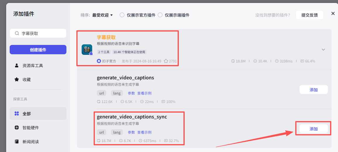 在输入框中输入字幕获取,看到我们框选出来的这个插件,选择添加他的generate_video_captions_sync接口