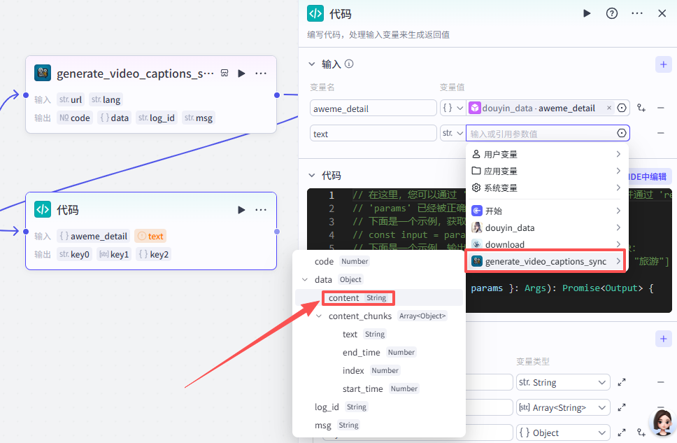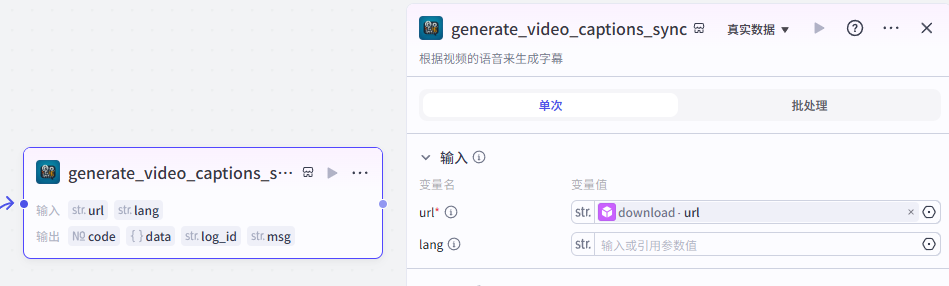 然后使用【字幕获取】插件的“generate_video_captions_sync”,完成对下载好的视频进行文案提取