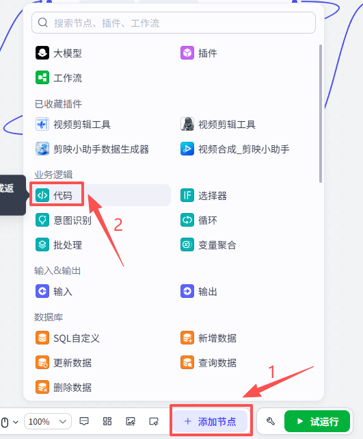点击添加节点,选择代码