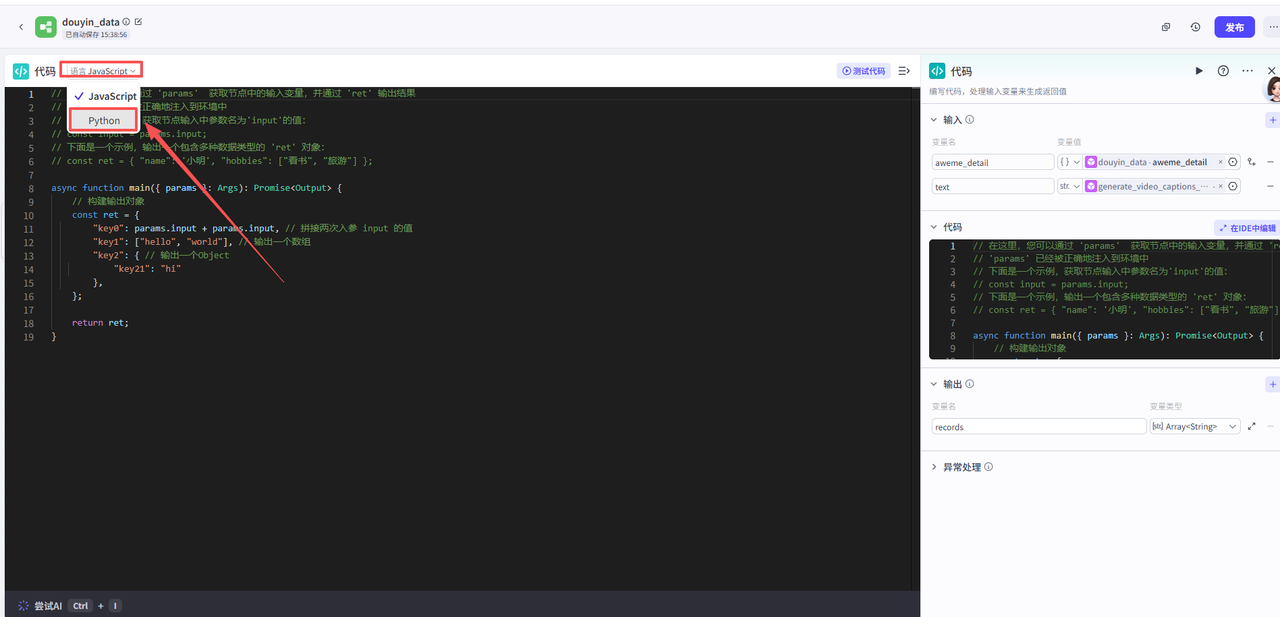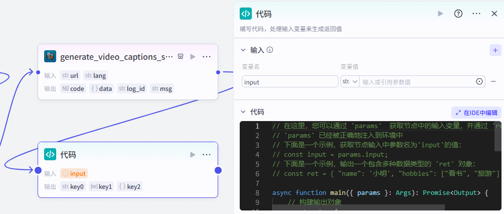 添加之后就是这样,把它和上一个节点链接起来,这里需要配置一下这个节点的输入输出和代码详情