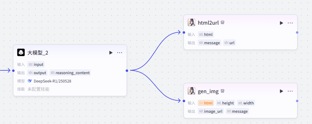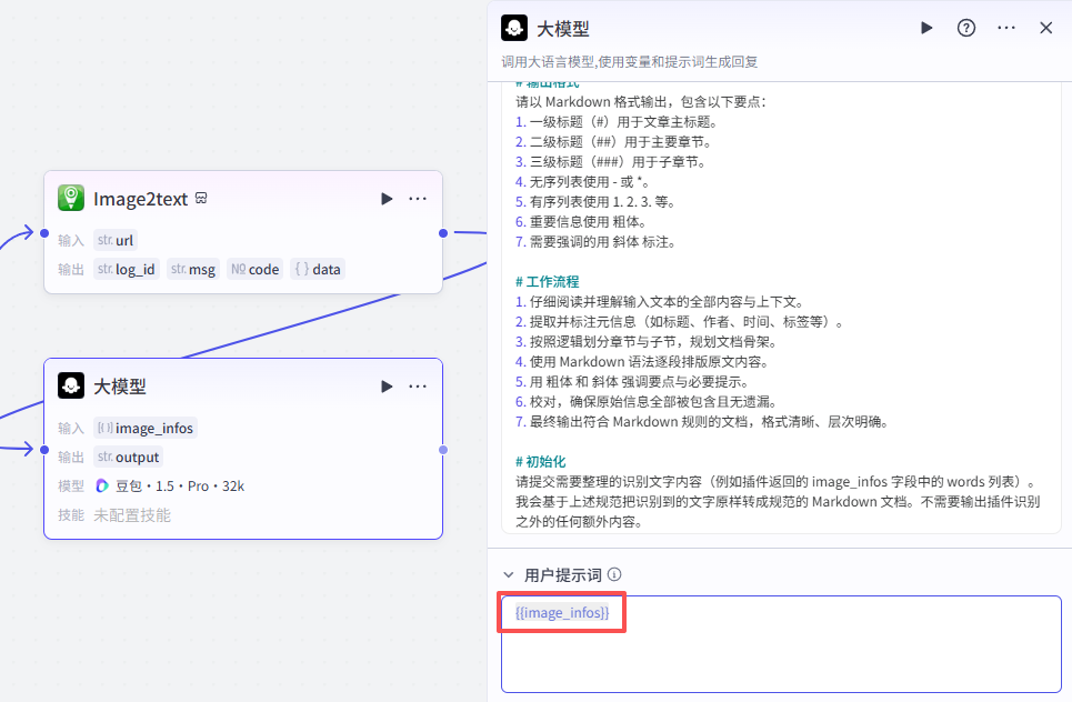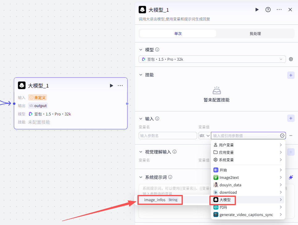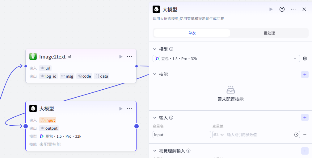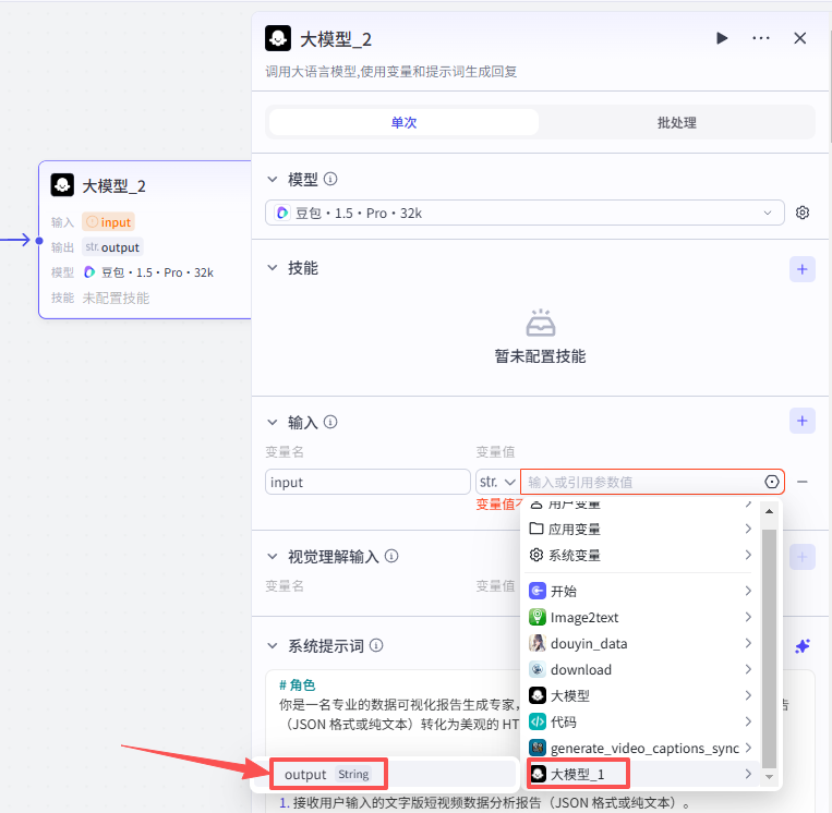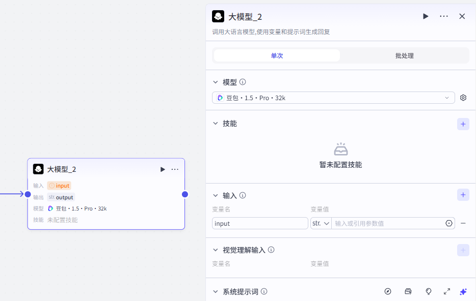 添加进来就是这样,将它跟前一个大模型节点相连,需要配置大模型、输入输出以及提示词