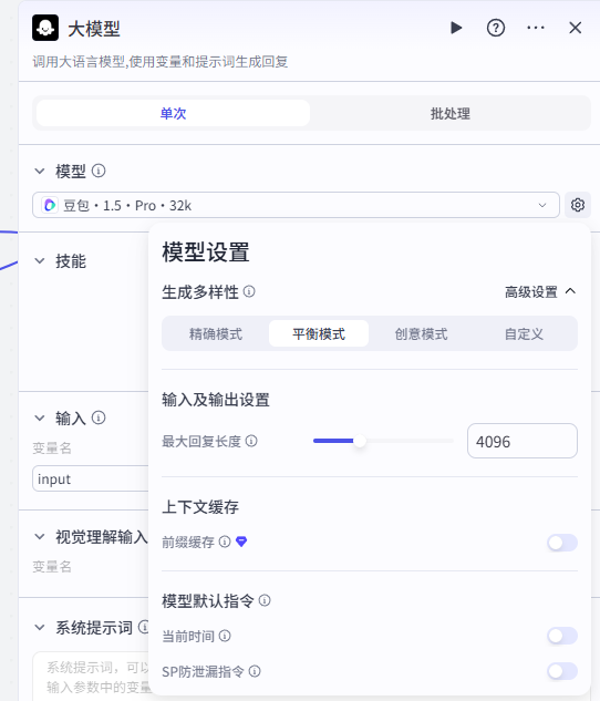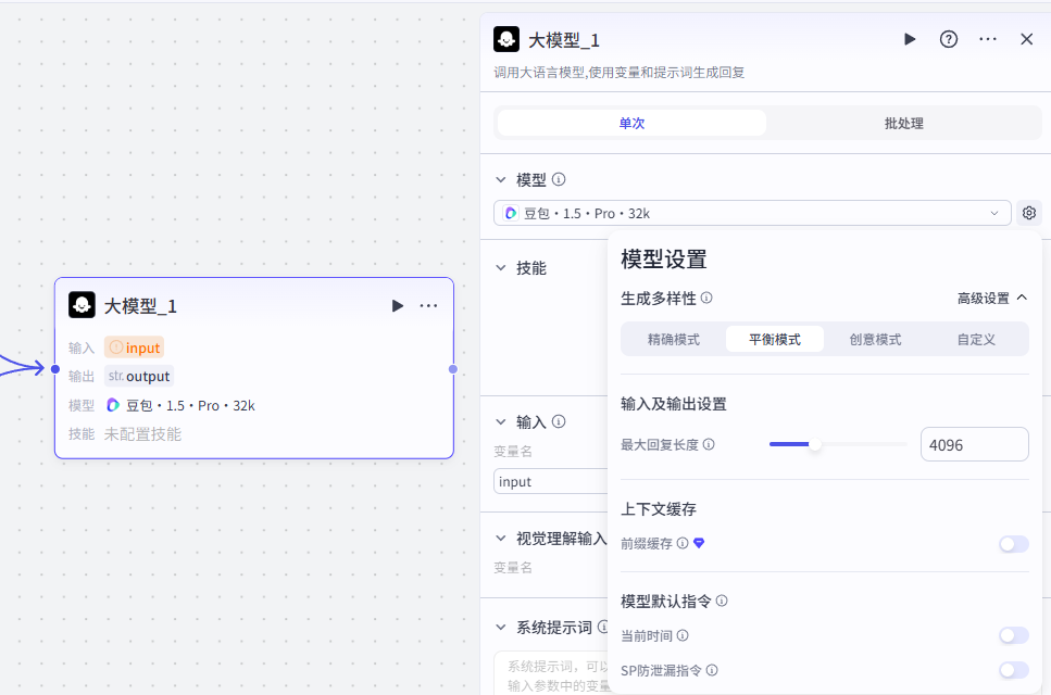 需要配置大模型、输入输出以及提示词
