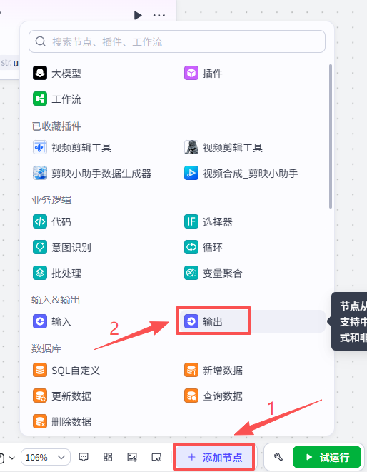 点击添加节点,选择输出