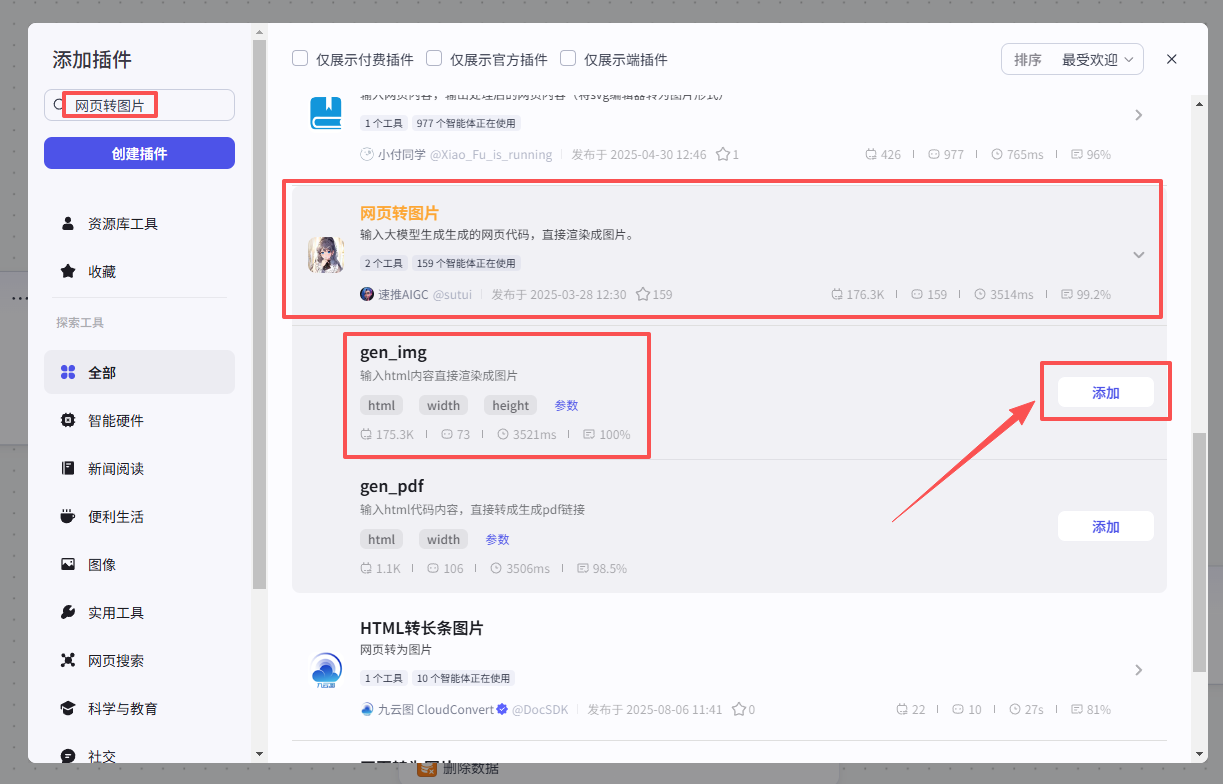 在输入框中输入网页转图片,看到我们框选出来的这个插件,选择添加他的gen_img接口
