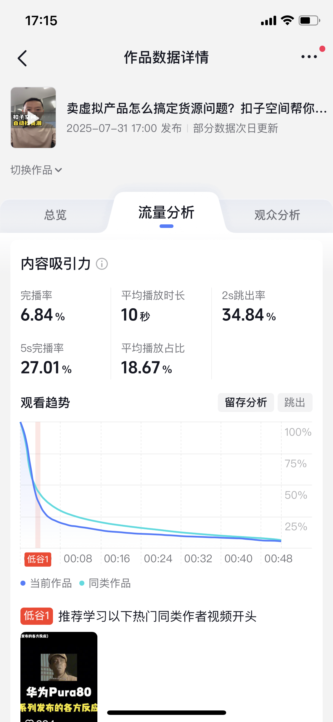 获取关键数据指标:包括播放量、完播率、5s 完播率、2s 跳出率、平均播放时长、平均播放占比,帮助快速定位视频真实表现