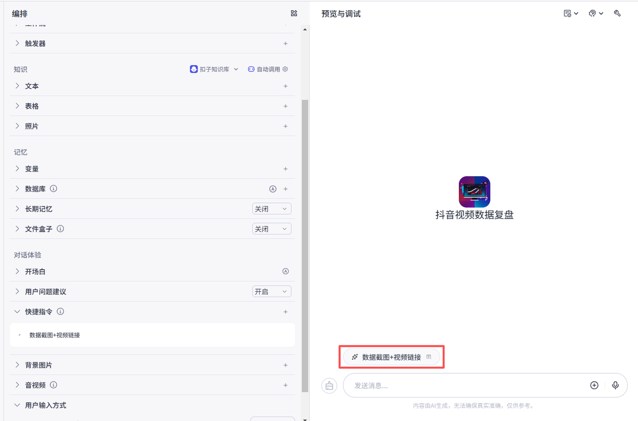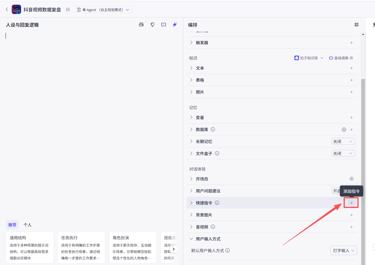 在个人空间创建一个新的智能体,命名“抖音视频数据复盘”