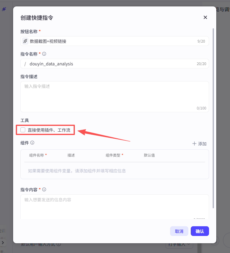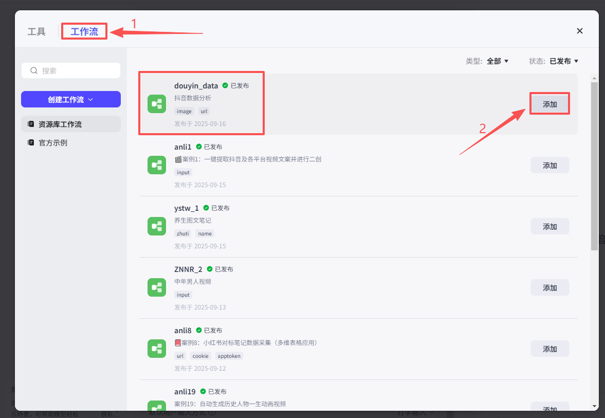 在弹窗中选择工作流,然后看到我们刚刚发布的抖音数据分析工作流,点击添加