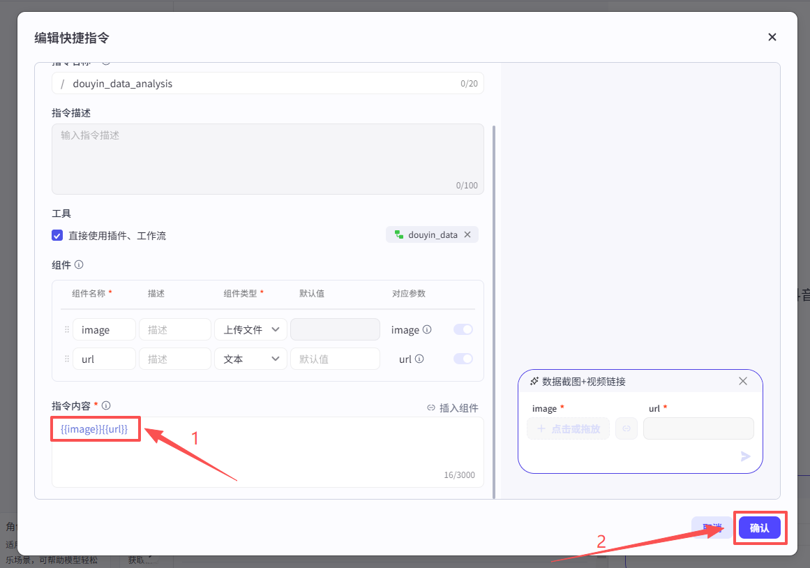 然后在指令内容部分再添加上变量名称,点击确认